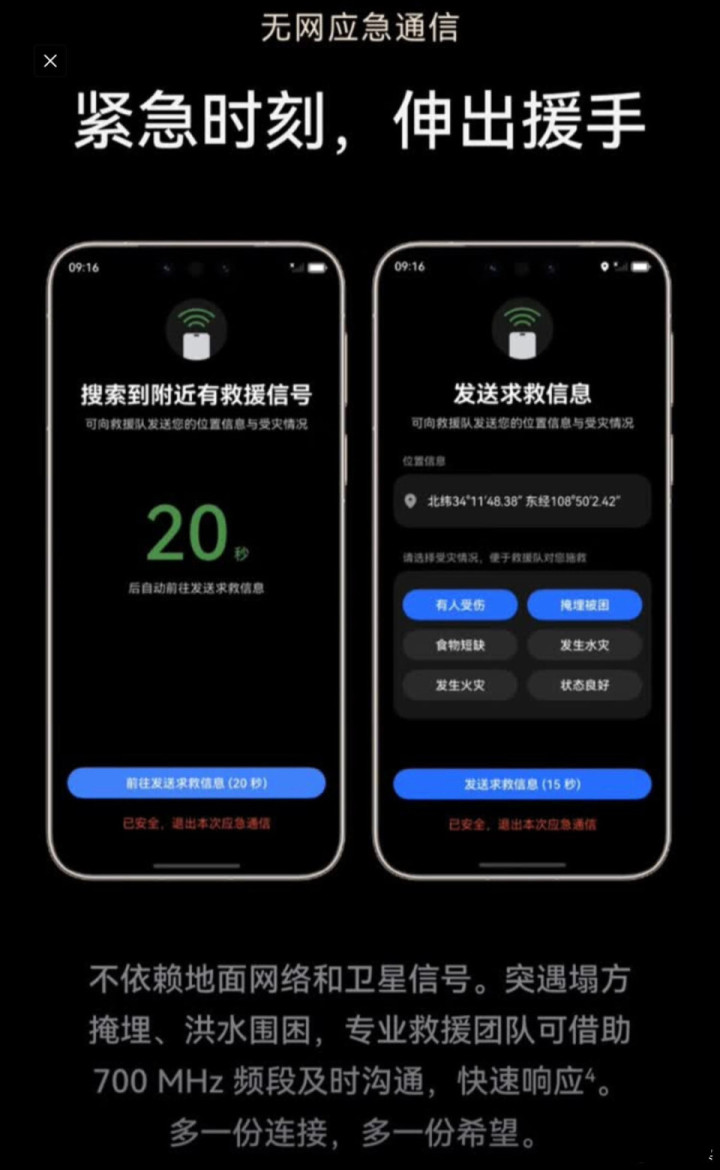 不仅支柱卫星通讯,这次该机还在业界首发了“无网救急通讯”功能。该功能愚弄700MHz低通常段无线电波强大的穿透和远距离传输特色,随机在大地辘集齐全瘫痪的灾害或搭救场景下,完了最远13公里、并可穿透三堵墙的通讯归拢,在城市灾害、户外搭救等场景号称过失时刻的“救命”神器,为紧要情况增添了一份贵重的但愿。